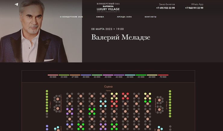 Валерий Меладзе планирует выступить 8 марта 2023 года в БарвихеДействительно, на 8 марта 2023 года у Меладзе запланирован большой сольный концерт в элитном концертном зале Москвы в Барвихе. Примечательно, что места раскуплены уже больше чем на половину, несмотря на высокие цены. Правда, в продаже еще есть самые дорогие — по 70 тысяч рублей, находящиеся рядом со сценой.