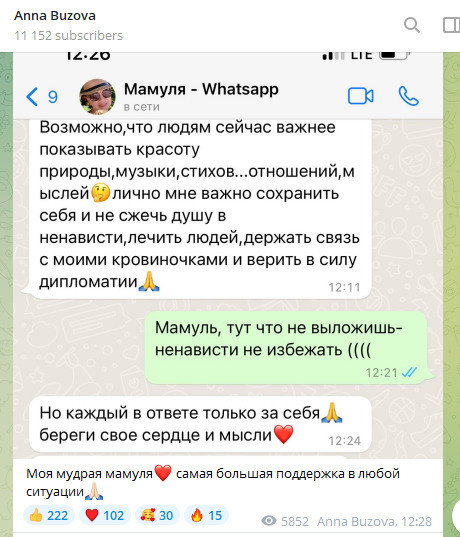 «Возможно, что людям сейчас важнее показывать красоту природы, музыки, стихов, отношений, мыслей. Лично мне важно сохранить себя и не сжечь душу в ненависти, лечить людей, держать связь с моими кровиночками и верить в силу дипломатии. Каждый в ответе за себя. Береги свое сердце и мысли», — отметила Бузова-старшая в личной переписке с дочерью.