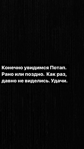 не пропуститеДавай, до свидания, или многочисленные романы ТиматиСам Тимати не стал молчать и ответил в соцсетях Потапу. «Конечно, увидимся. Рано или поздно. Как раз, давно не виделись. Удачи», — написал музыкант.