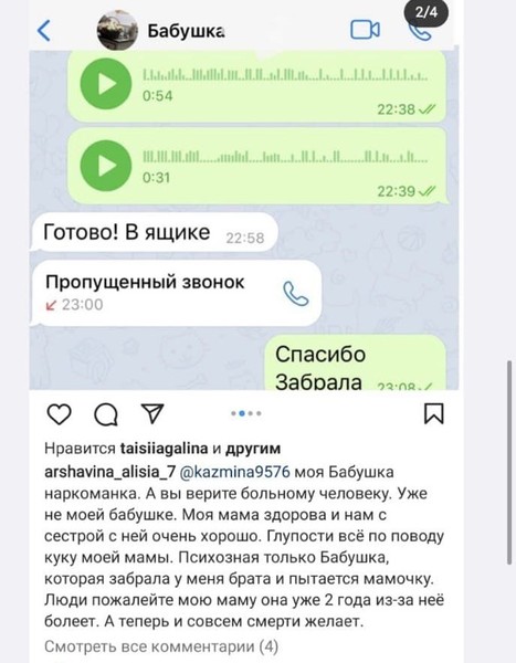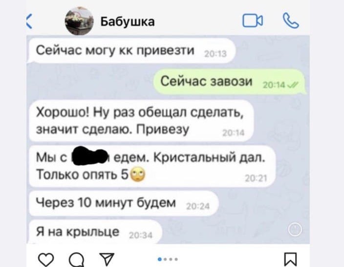 Скриншоты Алиса действительно выложила. На них видно, как некий человек, записанный в телефоне как «Бабушка», общается с другим пользователем. «Готово! В ящике»; «Мы едем. Кристальный дал, через 10 минут будем на крыльце», — посредством таких фраз и происходит общение. Подтвердить их подлинность нельзя, как и опровергнуть.