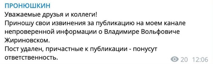 Вскоре Пронюшкин поспешно удалил заявление о кончине 75-летнего политика. «Уважаемый друзья и коллеги! Приношу свои извинения за публикацию на моем канале непроверенной информации о Владимире Вольфовиче Жириновском. Пост удален, причастные к публикации понесут ответственность», — написал сенатор.