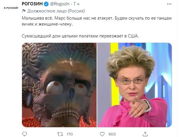 «Малышева все. Марс больше нас не атакует. Будем скучать по ее танцам яичек и женщине-члену. Сумасшедший дом целыми палатами переезжает в США», — написал глава госкорпорации.