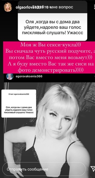 «Вы ж моя секси-кукла! Сначала русский подучите, а потом вас вместо меня возьмут. Я же буду вместо вас сиси на фото демонстрировать», — заявила Ольга, выставив откровенный снимок подписчицы.
