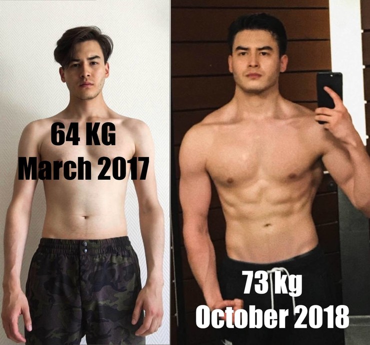 «На первом фото март 2017 год, 64 килограмма, мой самый низкий вес. Я тогда сильно заболел и особо не занимался спортом. На втором фото октябрь 2018, 73 килограмма, когда я вошел в удовлетворительную форму после того периода. В тот момент готовился выступать в Швейцарских национальных соревнованиях по боксу. К сожалению, травмировал локоть за несколько месяцев до начала», — говорит Димаш.