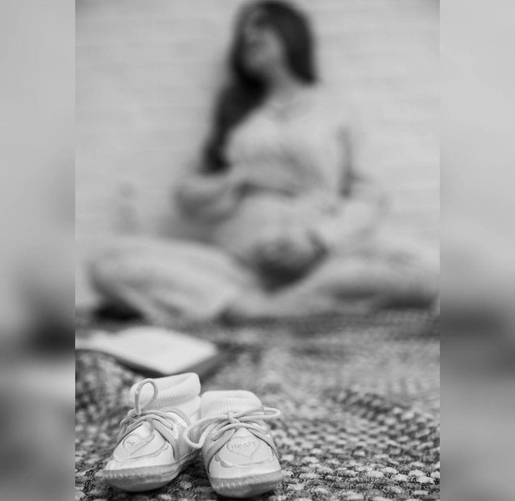 На снимке 38-летняя артистка нежно держит живот обеими руками. Силуэт Марины размыт, так как все внимание фотограф сконцентрировал на переднем плане — крохотных пинетках.