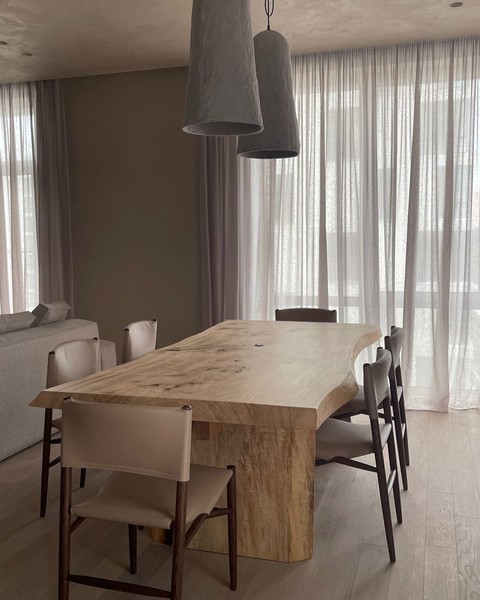 «В квартире много дерева. Основная часть деревянных предметов, в том числе этот стол, сделаны на заказ», — похвасталась Саша.