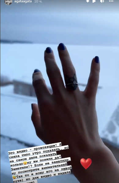 Ну, а 14 февраля Агата Муцениеце похвасталась элегантным кольцом на безымянном пальце. «Это видео — провокация. Я сняла его, чтобы показать утро, но на самом деле хотела показать кольцо. Вы заметили его? Если нет, то посмотрите внимательнее», — пошутила артистка.