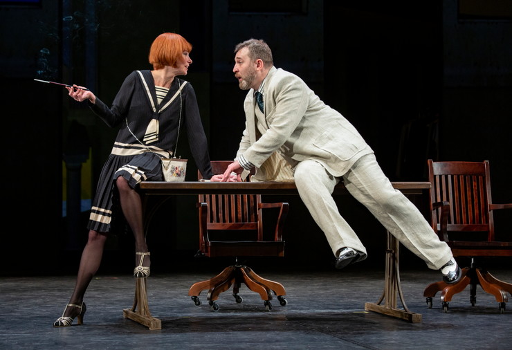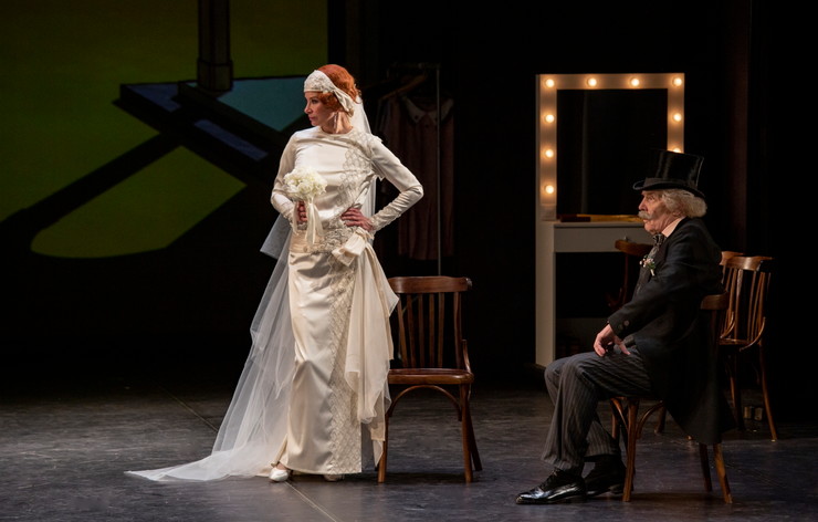 Что касается декораций, то здесь скорее царит минимализм — фонтанчик, стол, стулья, граммофон, зеркало. Но в один из ключевых моментов (тот самый спор между Катариной и Петруччо про Луну и Солнце) на подмостки вдруг закатывается настоящий ретро-автомобиль, что, конечно, расставляет акценты.