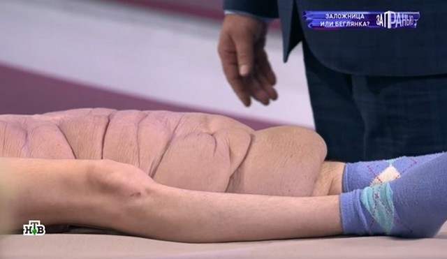 Нога увеличилась в три разаЗа последние 10 лет опухоль увеличилась в три раза и теперь свисает несколькими слоями кожи — эксперты, присутствовавшие в студии программы «За гранью» поразились тому, что увидели. В их врачебной практике такое впервые. Больше того, они были в шоке, когда девушка не смогла назвать им точный диагноз, отметив, что нога болит и она не может передвигаться без ходунков.