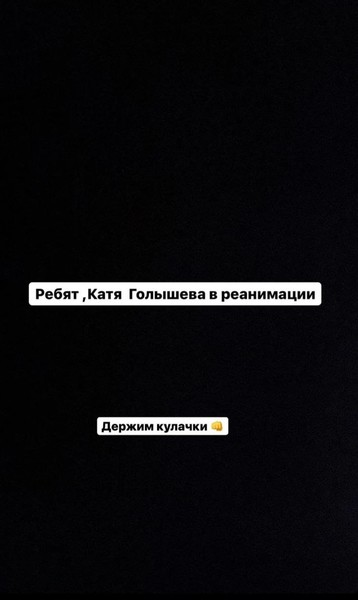 20-летняя звезда соцсетей вчера опубликовала снимок из скорой помощи и подписала фото: «Молния была красивая». Спустя некоторое время продюсер блогеров Заир Юсупов написал: «Ребята, Катя Голышева в реанимации, держим кулачки».