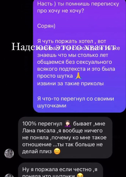 «Насть, помнишь перепису про хочу-не хочу? Сорян, я чуть поржать хотел, вот и написал. А ты мы столько лет общаемся без сексуального подтекста. Это была просто шутка. Извини за такие приколы! — отметил 41-летний исполнитель. — Я что-то перегнул со своими шуточками».