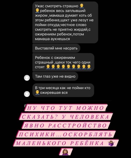 «Ужас. Ребенок весь заплывший, о чем думает мамаша? Щеки лезут, глаз уже не видно. В три месяца ожиревшая вся», — написала незнакомка.