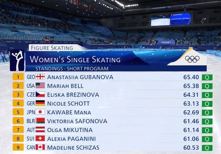 Александра ТрусоваНа 15.00 прошло половина соревнований. На данный момент лидирует грузинка Анастасия Губанова, у нее 65.40 балла, на втором месте Мэрайа Белл с 65.38 балла. Третью строчку занимает японка Мана Кавабэ — у нее 62.69 балла. Но все они даже рядом не могут приблизиться по технике программы к нашим спортсменкам.