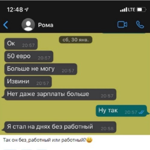 не пропуститеБеспринципная разлучница или несчастная женщина — кем стала Анастасия Макеева в глазах толпы«Переведу 50 евро. Больше не могу. Извини. У меня даже нет зарплаты. Я на днях стал безработным», — пожаловался ей Роман.