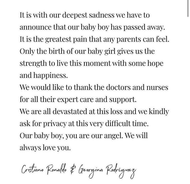 «С глубочайшей грустью сообщаем о смерти нашего малыша. Это самая большая боль, которую может испытать любой родитель. Только рождение нашей девочки дает нам силы прожить этот момент с надеждой и счастьем. Мы хотели бы поблагодарить врачей и медсестер за оказанную помощь и поддержку. Мы опустошены и просим о конфиденциальности в это очень трудное время. Наш мальчик, ты наш ангел. Мы будем любить тебя вечно», — поделился Роналду.