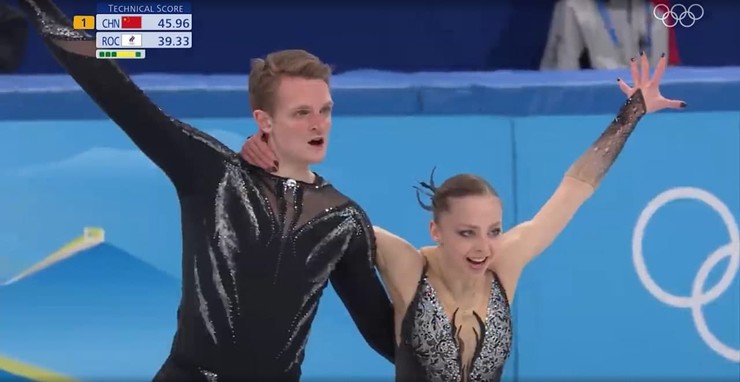 Евгения Тарасова — Владимир Морозов У наших пар появились конкуренты. Китайцы показали прекрасный прокат. Были небольшие помарки, но все равно было здорово, ничего не скажешь. Чистый тройной тулуп, затем тройной флип на выбросе. Они стали лидерами — 84.41.