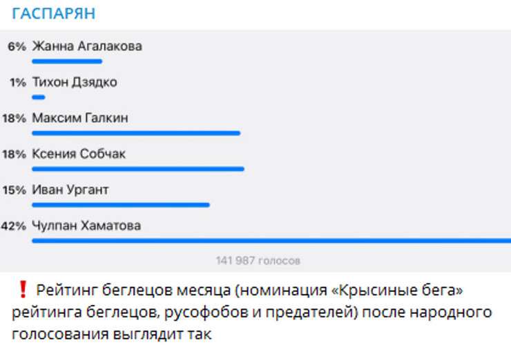 Журналист и блогер в своем Telegram-канале опубликовал итоги голосования среди подписчиков. Опрос был по теме: в каких звездах вы разочаровались за последнее время. «Номинация «Крысиные бега» рейтинга беглецов, русофобов и предателей выглядит так», — уточнил Гаспарян.
