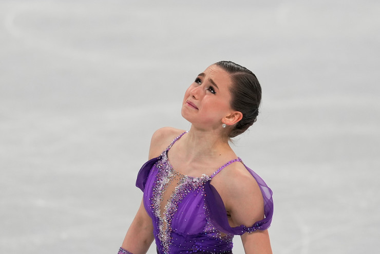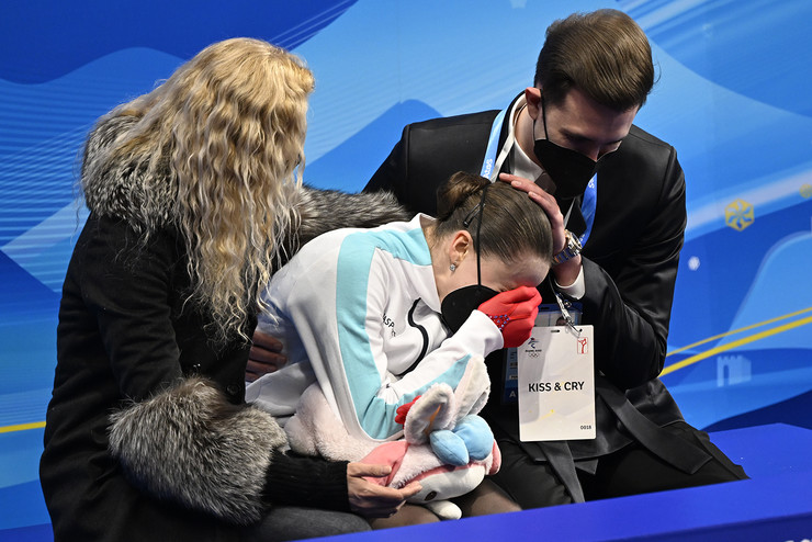 После нескольких ошибок Камила опустила руки и перестала бороться за победу Этери Тутберидзе старалась оградить подопечную от травли, поклонники писали слова поддержки. Вся команда свято верила, что несмотря на жесткий прессинг с многочасовым заседанием, затягивание решения по поводу возможности участия в одиночных соревнованиях и вручения медалей за прошлые достижения и бесконечное муссирование версий о попадании в кровь запрещенного препарата Камила справится с давлением и победит. Но 15-летняя девочка буквально сломалась и не выполнила в произвольной тех элементов, которые ранее делала идеально.