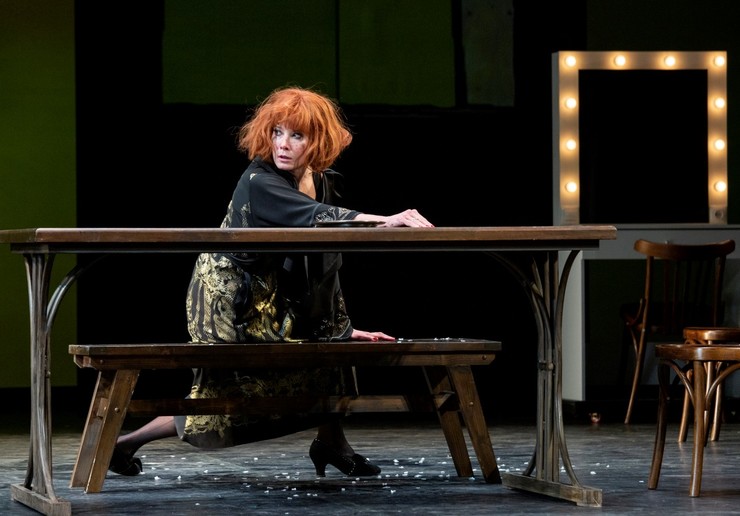 Что касается декораций, то здесь скорее царит минимализм — фонтанчик, стол, стулья, граммофон, зеркало. Но в один из ключевых моментов (тот самый спор между Катариной и Петруччо про Луну и Солнце) на подмостки вдруг закатывается настоящий ретро-автомобиль, что, конечно, расставляет акценты.