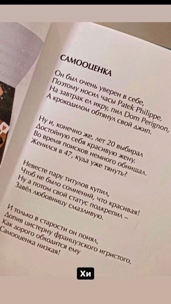 Речь идет о мужчине, который носит дорогие часы, ест икру на завтрак, шикарно одевается и предпочитает исключительно престижные автомобили. Кроме того, герой стихотворения — настоящий ловелас, который находится в постоянном поиске идеальной жены. И даже будучи с невестой заводит отношения на стороне. Посудите сами, чем не Тимати? Ну а завершается стихотворение весьма ироничным умозаключением. Автор объясняет сей пафос мужчины всего лишь следствием низкой самооценки.