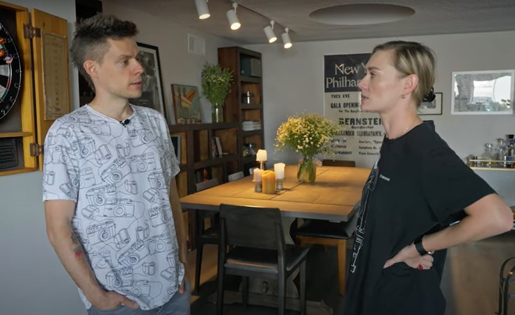 Актриса пригласила в дом съемочную группуСудя, по кадрам, супруги арендовали квартиру-студию, где в одном пространстве расположены зоны для кухни, работы и отдыха. Кровать же расположена за ширмой по соседству с барной стойкой. Зато можно заметить камин, который придает пространству дополнительный уют.