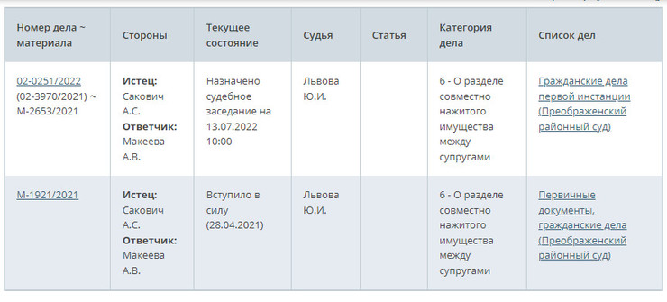 В суде Сакович хочет решить судьбу совместно нажитого имущества в барке с МакеевойАртистка не скрывает, что Роман сумел сделать ее по-настоящему счастливой. Сейчас Макеева мечтает подарить избраннику ребенка.
