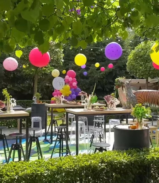 Диброва выбрала экзотический декорГостей праздника ждал праздничный обед под открытым небом. Площадку украсили воздушными шарами и фигурами диких животных. Сама Полина появилась в платье с анималистическим принтом, а волосы собрала в пышный пучок.